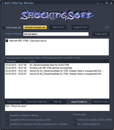 Пояснение некоторых функций и кнопок: Full process list - полный список процессов на вашем компьютере. Refresh process list - обновление списка процессов. Patch HLDS - установка защиты на ваш сервер. Unpatch HLDS - снятие защиты. Custom message - сообщение, которое будет показано хакеру в момент атаки. Timestamp - дата/время включения защиты. Action - действия с вашими серверами. Save log to file - сохранить лог защиты в файл. Autostart on Windows Startup - автоматический запуск программы AntiCSDos при включении компьютера. Autopatch all HLDS.exe processes on start - автоматическая установка защиты на все процессы hlds.exe при включении программы. Autocheck & Autopatch all HLDS.processes every 3 minutes - автоматическое нахождение всех процессов hlds.exe и установка на них защиты (так же автоматически).